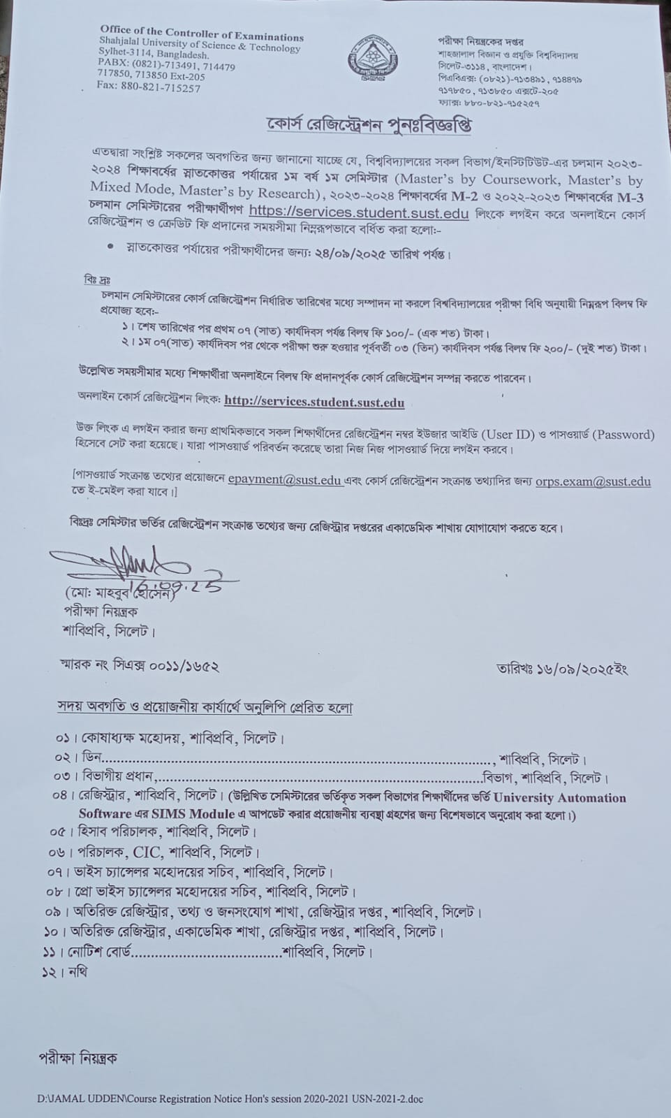 * স্নাতকোত্তর পর্যায়ের পরীক্ষার্থীদের জন্য: ২৪/০৯/২০২৫ তারিখ পর্যন্ত। (হার্ড কপি সংযুক্ত)