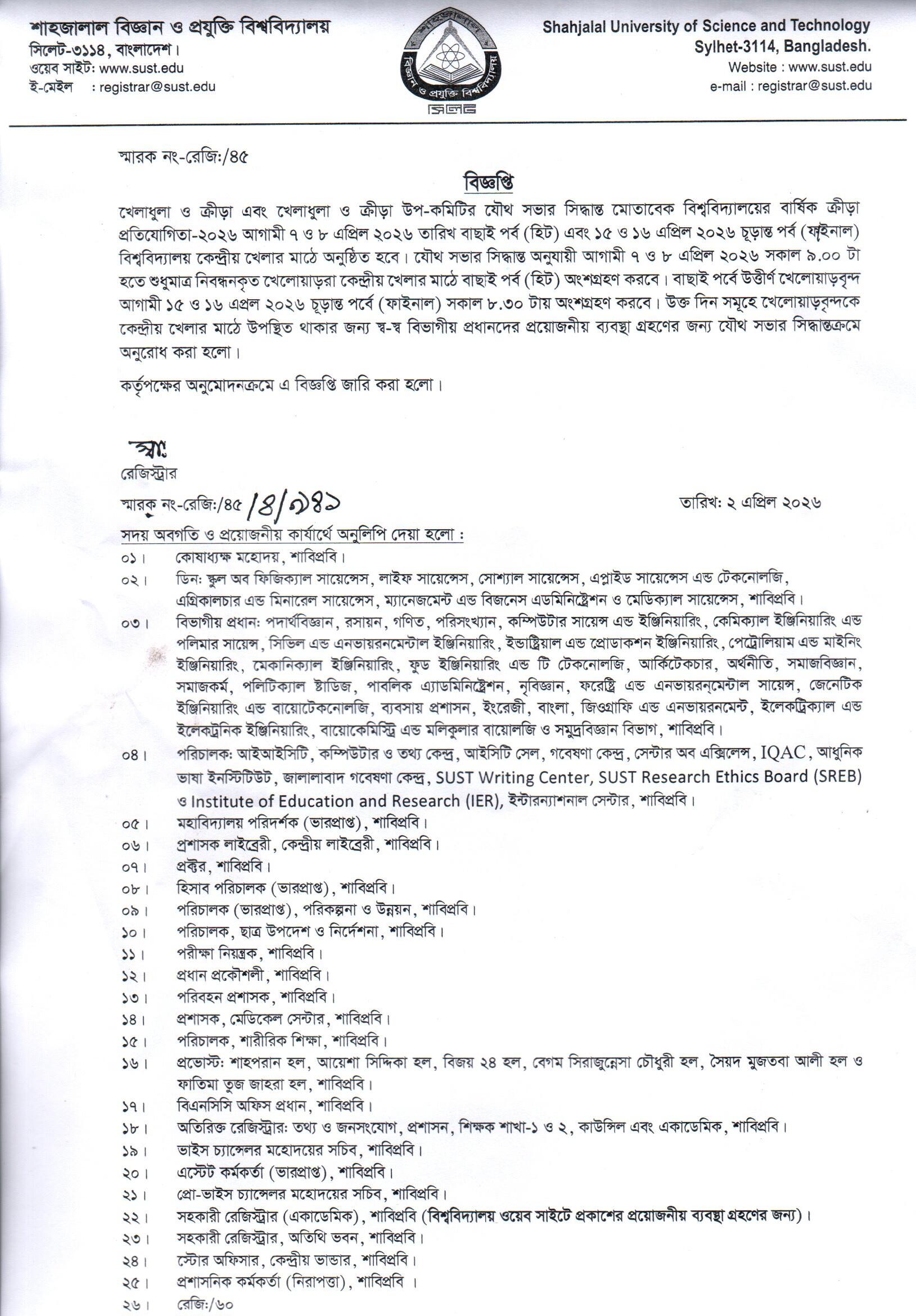 বিশ্ববিদ্যালয়ের বার্ষিক ক্রীত প্রতিযোগিতা-২০২৬ আগামী ৭ ও ৮ এপ্রিল ২০২৬ তারিখ বাছাই পর্ব (হিট) এবং ১৫ ও ১৬ এপ্রিল ২০২৬ চূড়ান্ত পর্ব অনুষ্ঠিত হবে। (বিজ্ঞপ্তি সংযুক্ত)