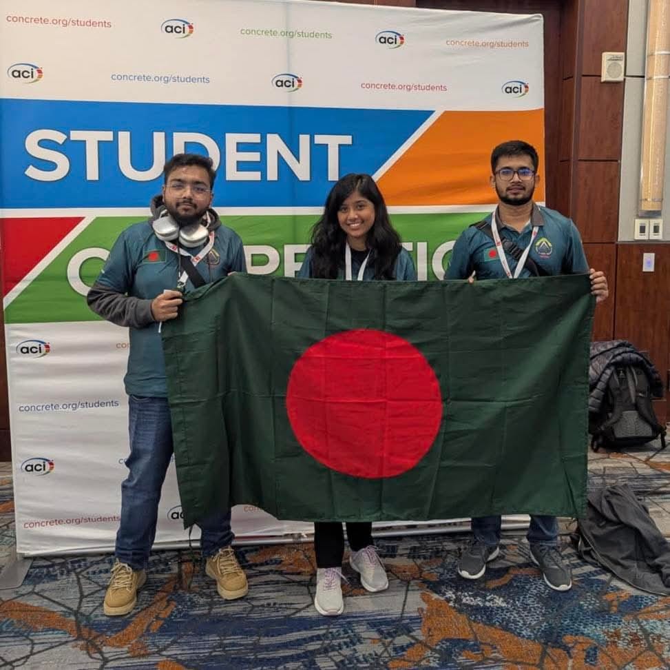 Team Eco Genesis (Abu Yeahia, Md Nadiruzzaman Naef & Farhana Islam Proma) from the Department of Civil & Environmental Engineering (CEE), SUST proudly represented Bangladesh at the ACI Concrete Competition 2025 held in Baltimore, USA — and they were the only team from South Asia to participate!