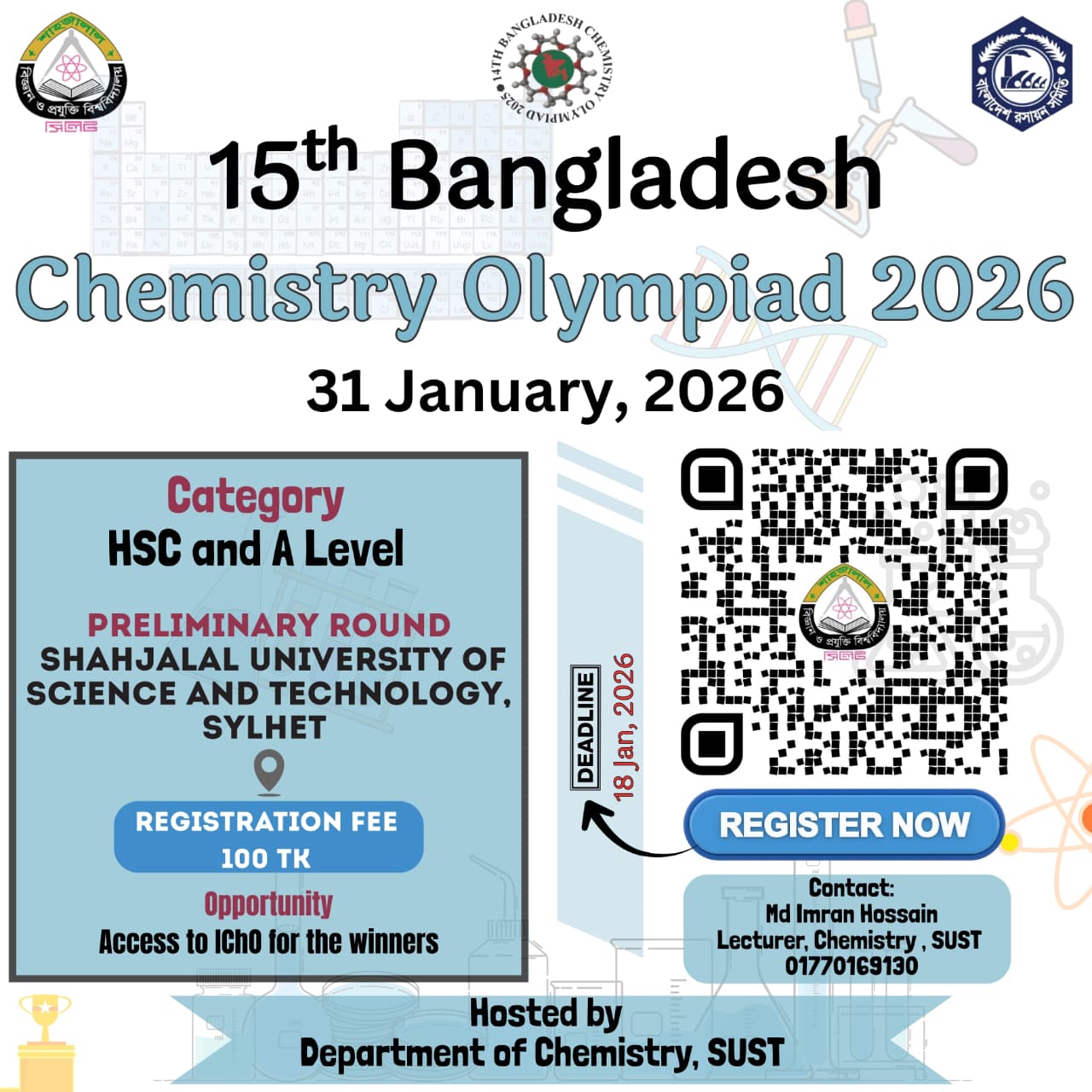 ১৫তম বাংলাদেশ রসায়ন অলিম্পিয়াডের আঞ্চলিক পর্বের রেজিস্ট্রেশন শুরু হয়েছে। শাহজালাল বিজ্ঞান ও প্রযুক্তি বিশ্ববিদ্যালয়ের (শাবিপ্রবি) রসায়ন বিভাগের আয়োজনে আগামী ৩১ জানুয়ারি ২০২৬ এ অনুষ্ঠিত হতে যাচ্ছে সিলেট অঞ্চলের প্রিলিমিনারি রাউন্ড।
