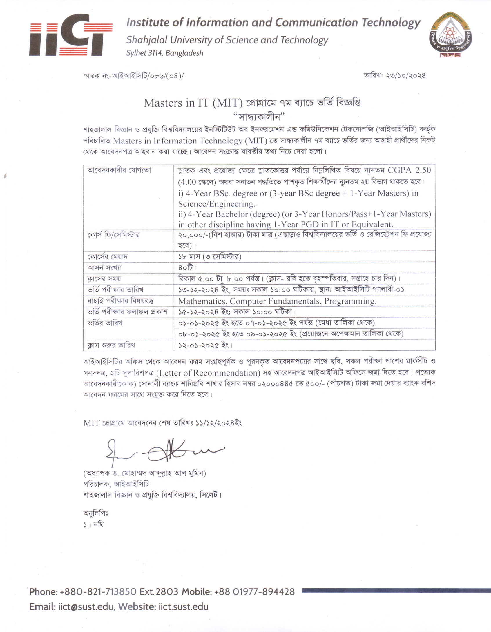 শাহজালাল বিজ্ঞান ও প্রযুক্তি বিশ্ববিদ্যালয়ের ইনস্টিটিউট অব ইনফরমেশন এন্ড কমিউনিকেশন টেকনোলজি (আইআইসিটি) কর্তৃক পরিচালিত Masters in Information Technology (MIT) তে সান্ধ্যকালীন ৭ম ব্যাচে ভর্তির জন্য আগ্রহী প্রার্থীদের নিকট থেকে আবেদনপত্র আহবান করা যাচ্ছে । আবেদন সংক্রান্ত যাবতীয় তথ্য সংযুক্ত কপিতে দেয়া আছে ।