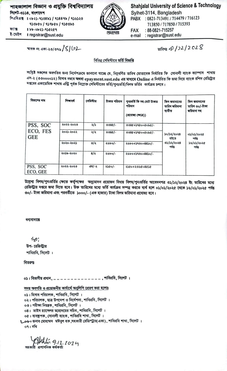 বিভিন্ন সেমিস্টারে ভর্তি বিজ্ঞপ্তি