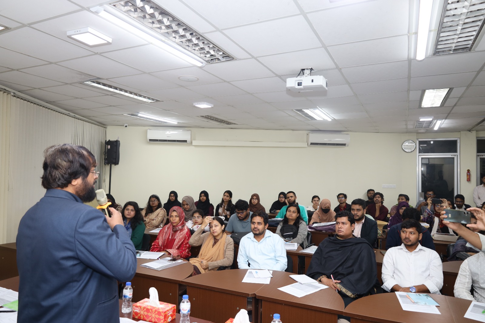 বিশেষ অতিথির বক্তব্যে প্রো-ভাইস চ্যান্সেলর অধ্যাপক ড. মোঃ সাজেদুল করিম বলেন, আমরা এমন একটি চমৎকার শিক্ষাবান্ধব পরিবেশ তৈরি করতে চাই যেখানে শিক্ষার্থীরা তাদের বিষয়ভিত্তিক জ্ঞান আরও সমৃদ্ধ করতে পারবে। একই সঙ্গে তারা যেন শুদ্ধ ও সাবলীলভাবে বাংলা বলা ও লেখার দক্ষতা অর্জন করতে পারে। প্রয়োজনে সে ভাষার জ্ঞানকে আন্তর্জাতিক বিভিন্ন ভাষায় রূপান্তর করার সক্ষমতা অর্জন করতে পারে। আমাদের প্রত্যাশা, সব অনুষদের শিক্ষার্থীরা যখন ৪র্থ বর্ষে পৌঁছাবে তখন তারা যেন গর্বের সাথে বলতে পারে যে তারা ইতোমধ্যে এক বা একাধিক পাবলিকেশনের মালিক হয়েছে। গবেষণা ও প্রকাশনার এই সংস্কৃতি ভবিষ্যতের ক্যাম্পাসকে আরও সমৃদ্ধ করবে।
