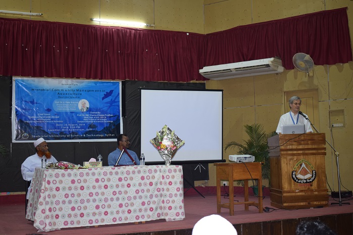 A science talk on 'Microbial Community Management in Aquaculture' was held on 25 August at Mini Auditorium, SUST which was arranged by Department of GEB. The program was chaired by Prof. Dr. Shamsul Haque Prodhan. The Keynote speaker was Prof. Dr. ir Peter Bossier, Director of Aquaculture and Artemia Reference Center, Ghent University, Belgium.