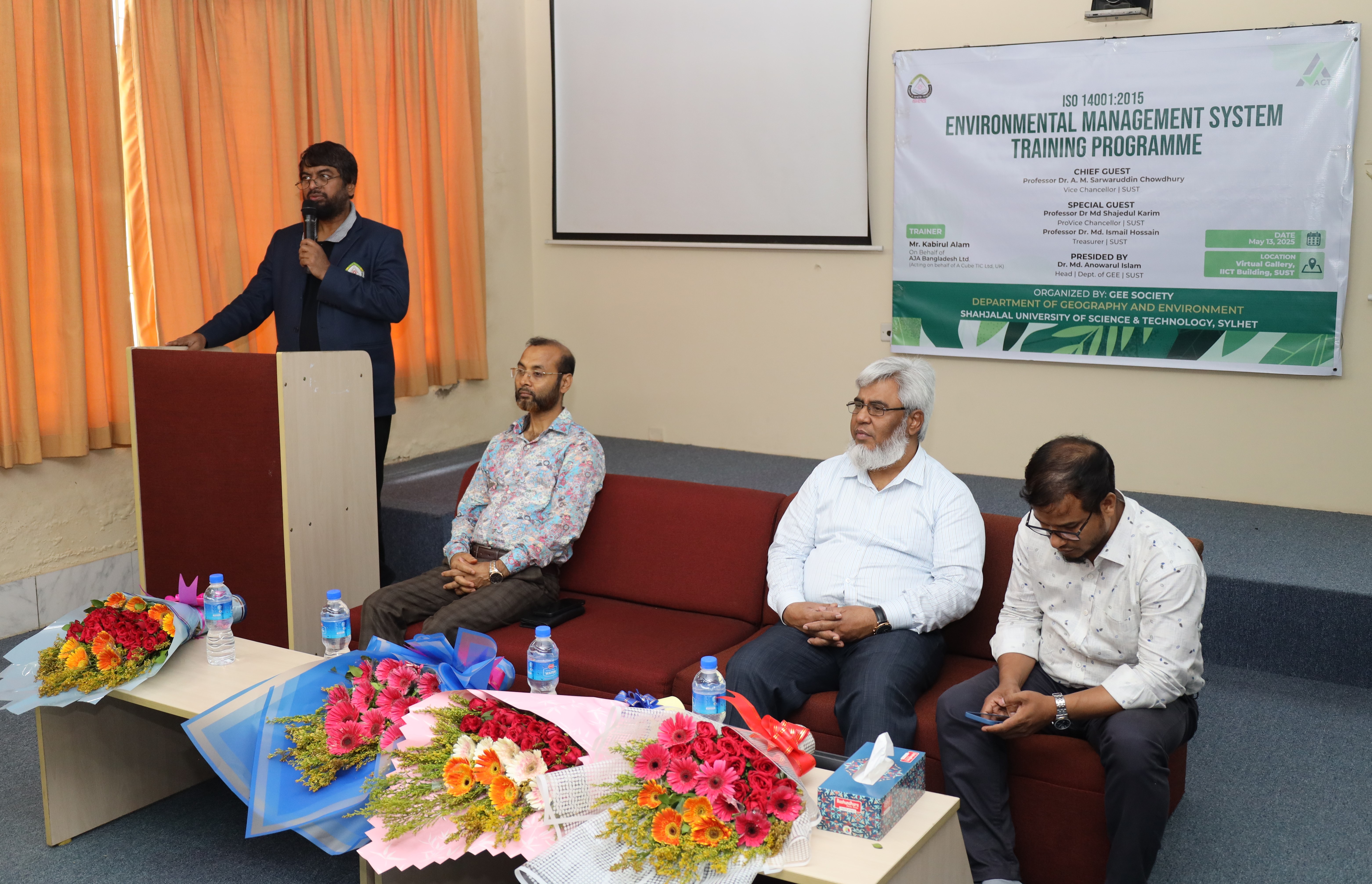 শাহজালাল বিজ্ঞান ও প্রযুক্তি বিশ্ববিদ্যালয়ের (শাবিপ্রবি) জিওগ্রাফি এন্ড এনভারনমেন্ট বিভাগের উদ্যোগে আজ মঙ্গলবার (১৩ মে, ২০২৫) সকাল ১০টায় আইআইসিটি ভবনের ভার্চুয়াল ক্লাসরুমে "ইনভাইরনমেন্টাল ম্যানেজমেন্ট সিস্টেম" বিষয়ক এক প্রশিক্ষণ কর্মসূচি অনুষ্ঠিত হয়েছে।